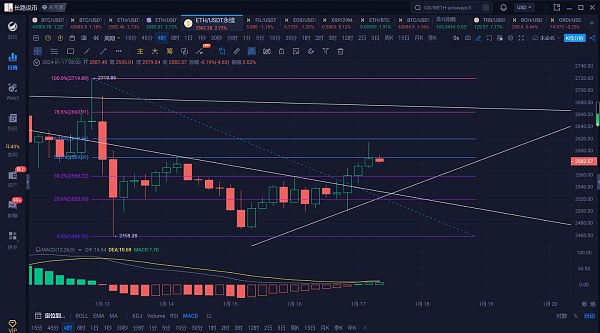 以太坊上个交易日白盘整体处于震荡上行中,晚盘反弹2548附近一波大跌最低跌至2500附近并未跌出新低而后开始反弹,一波诱空的操作,今天凌晨行情最高涨至2613附近高点回踩,现行情位于2580附近震荡。