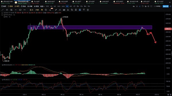 以太反弹到2600点附近出现回落,日线级别调整没有结束,MACD指标上行出现缩量,KDJ出现背离,建议2600附近尝试空单,目标看到2500附近。