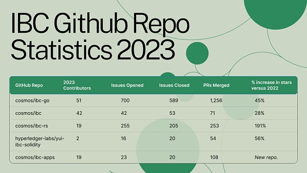 关于 GitHub 的活动,这里有一些数据可以显示直到 2023 年 11 月底,ibc、ibc-go、ibc-rs、ibc-apps 和 ibc-solidity 仓库的开发进度。今年一共有 1742 个 PR 被合并。