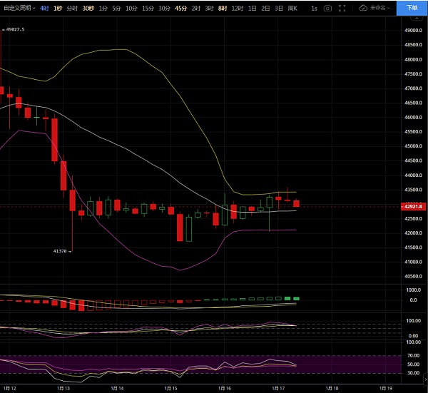 个人觉得本周前两天的的主旋律就是个箱体震荡,也没有去过多分析,行情在经历了上周多次的来回洗盘后,也是给那些追涨杀跌的人好好上了一课,我们期待的单边还是未能走出来,价格既然再次回到43300-43500测压区域,昨日比特币走势还是保持先跌后涨的走势在运行,行情昨日币价最低回调到42000一线附近,并未继续再次下行,随后快速反弹币价最高触及43500附近,上下跌涨来回有2500点空间,给行情点时间,也给自己一点时间,等待进一步的破位信号指引出现。