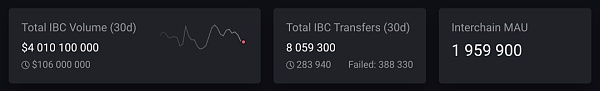 截至2024年1月15日,IBC 协议已经在107个区块链上启动,过去30天总交易量 $40+ 亿,安全跨链交互800+万次。当然,目前绝大多数跨链发生在 Cosmos SDK 区块链之间。