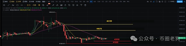 从图片中可以看出,前天大饼四小时级别向下插针42050后价格开始反弹,但是反弹力度依旧不高。不过从K线上可以看出,大饼底部近期是在不断抬高的,从指标上来看,目前大饼已经运行在四小时级别5 10MA均线上方,短期呈现出多头趋势。