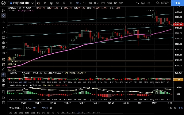 以太坊走势与思路一致,昨日白盘最高反弹至2548一线受阻,随后行情震荡回落最低跌至2421一线支撑反弹,恭喜跟上高空思路的朋友,目前币价在2457附近运行,四小时级别行情回踩至ma90均线支撑,k线由阴转阳低点抬高,macd空头无量运行双线,短期行情有止跌迹象关注反弹力度,2500不破可以进空,日线级别连阴回落可见走势偏空,但下跌力度有限,若k线能收在ma14下方预计会试探2370附近,思路建议高空低多对待,上方压制2500-2530,下方支撑2440-2400