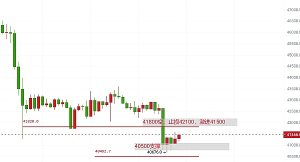 比特币昨日白盘走势平稳,昨天下午币价试图触摸43000受阻,晚间币价再次上冲42800时,直播间实时给出42800的做空思路,且群内给出预期时间3-5点会有结果;打开盘面可以看到,行情凌晨最低来到40676,比特币这波下跌的所有利润完美把握。四小时图上看今日白盘连续三根K线实体重叠,说明当前这一带是短线筹码密集交换区,附图MACD能量表现较弱,今日白盘币价最高冲至41500上方受阻,后市个人预计行情还是以震荡下跌为主,短线思路给到上方41800空,防守42100破位离场,激进41500进场;激进偷多40500,防守40200跌破离场。