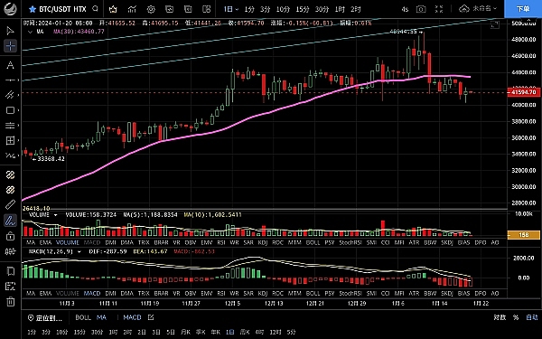 大饼昨日走势与思路一致白盘高位触及41568一线后受阻,晚间开始下跌,最低至40285一线支撑迅速反弹,恭喜跟上昨日思路的朋友空单获利一千点,目前币价在41640附近运行,四小时级别行情如约下探4w附近但没有跌破,k线由阴转阳,macd空头逐步缩量双线粘合有金叉迹象,短期空头暂时止跌,但多头反弹力度也不强,整体走势缓慢,上方有ma14压制若无法站稳则还有震荡下行的可能,日线级别空头逐步放量成死叉状态,前期多次都未打破的ma60转为压力线,短期不会那么容易突破,周末波动不大建议高空低多对待,上方压制42000-42500,下方支撑41300-40700