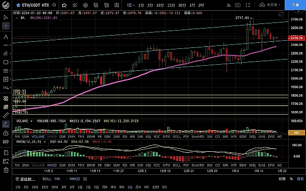 以太坊昨日一路上行最高反弹至2500一线受阻回落,最低跌至2415一线支撑多头迅速拉回,恭喜跟上昨日思路的朋友空单获利85点,目前币价在2480附近运行,四小时级别k线向下插针后迅速反弹拉回以大阳收线,但多头却没能延续,上方整体受ma14均线压制,短期连阴回落,macd空头缩量双线粘合,整体走势缓慢没有方向以窄幅震荡为主,日线级别价格跌至前期的强压区域目前转为支撑,虽没破位但走势依旧很弱,仍有再次下探的风险,2400不破的话可以高空低多操作,上方压制2500-2530,下方支撑2440-2400