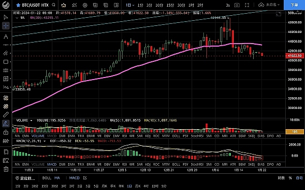 大饼昨日行情波动不大整体呈震荡走势,高位触及41870一线受阻,随后震荡下行,最低跌至41064一线支撑,恭喜跟上昨日思路的朋友空单盈利,目前币价在41200附近运行,四小时级别行情再次触及ma30均线受阻,k线连阴下行,macd多头缩量双线粘合,短期走势空头还未止跌仍有下行的风险,下方先关注40500-40000,若跌破4w关注38000可以分批抄底,日线级别整体呈震荡下行走势,碎步反弹大阴下跌,可见空头力度强势,思路建议反弹高空为主低多为辅,上方压制41800-42300,下方支撑40300-40000
