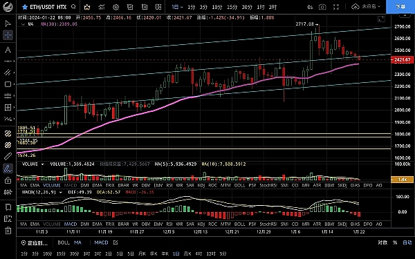 以太坊昨日走势与大饼一致,整体呈震荡走势,凌晨空头发力连阴下行,最低跌至2424一线支撑,恭喜跟上昨日思路的朋友空单获利,目前币价在2427附近运行,四小时级别行情横盘震荡后选择下行,k线三连阴,macd空头逐步放量双线有死叉迹象,短期走势空头没有止跌还有下行的需求,关注2400关口支撑情况,预计会有一波插针迅速反弹,激进可以抢一波,日线级别整体呈下行走势,日内有试探ma30的风险,macd空头逐步放量双线死叉向下,整体走势较为弱势,下跌不可怕这样才有机会抄底,以太坊市场是好的,只不过暂时被大饼拖累了,日内思路建议回踩支撑后先多后空,上方压制2450-2480,下方支撑2400-2350