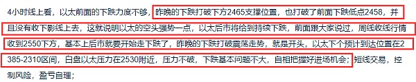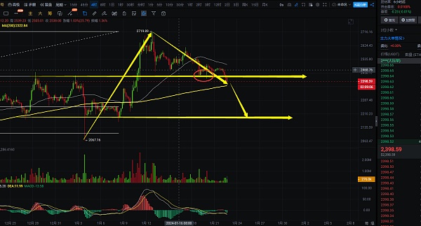 4小时线上看,以太的走势基本上是走下跌通道了,白盘走的是持续下跌,前面下跌收线后给到小反弹,但反弹的力度不是很大,说明以太市场也是空头强势,以太的这波下跌还有很大的空间,以太距离最近的支撑是2315-2205区间,到达这个区间后才有可能有做多的机会,晚盘以太将继续走下跌,目标就是2315-2205区间,上方压力是2470位置,该位置不破,空单就可持有,自行把握进场机会;短线交易,控制风险,盈亏自理;