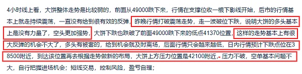 4小时线上看,大饼走势是比较弱的,前面下跌后就没有出现过像样的反弹,下方也没有很有力的支撑支持大饼走很大级别的反弹,从消息面上看,大饼现货ET公布后,不断的在吸资金,但是资金吸进来后,大饼并未出现反弹的迹象,说明现在市场打大了,拉盘需要更多的资金了,我个人是不看好有很大的反弹的,盘面上周线级别和短线上都是属于空头,晚间大饼应该还会有持续下跌,大饼在白盘下跌,4小时收一根底部十字星后,并未有反弹出现,而是继续走下跌试探,晚间大饼破40000的机会很大,40000跌破,下个支撑点位将会在39000附近,短线支撑到达后再去看下方收线情况做多单的布局,自行把握进场机会;短线交易,控制风险,盈亏自理;