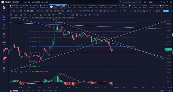 以太坊行情分析:周线级别跌破了4日均线的支撑,各技术指标仍是向下的走势,若是本周走出大阴线跌破了上上周的大阳线的一半,结合上周的十字星,那么有形成黄昏之星的走势,整体行情的顶部模型将更加牢固,大家需要注意本周的走势。而日线方面昨天跌破了中轨支撑走出大阴线,得治下方60日均线处才止住跌势,从技术面上看,虽然MACD仍处于放量状态,但其他技术指标有拐头的趋势,走出一波大跌行情后,行情会有震荡整体修复的走势,但可以看出昨天的大阴线有将之前涨势跌破的走势,会不会走出日线级别的画门走势,还需要行情的继续验证,下方可关注2285附近的支撑,上方则关注大阴线一半2375附近的压制。