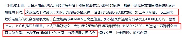 4小时线上看,大饼这波反弹虽然没有到42500位置,但也到了附近,从盘面上来看,大饼在该位置是承压,没有给到更高反弹,上方42500位置依旧是强压,上方有200日均线左右压力,走出进一步反弹的机会不是很大,大方向依旧还是空头趋势,周末行情可能会走的比较慢,交易上,大饼在42500附近作为压力去做布局,短线高点43589如果被破,空单就没有持有的意义了,短线回调目标区间在40100-39400,到达该区间再看下方38545低点破位,跌破看36000,自行把握进场机会;短线交易,控制风险,盈亏自理;