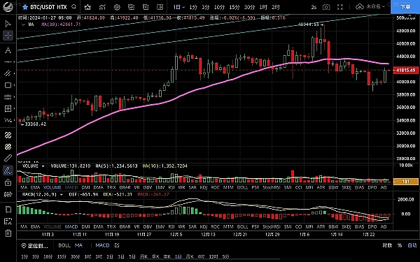 大饼昨日白盘波动不大,给人一种要回踩的错觉,低位跌至39900一线支撑,晚间行情直线拉升突破多个阻力,最高触及42250附近受阻回落,恭喜跟上低多思路的朋友,目前币价在41870附近运行,四小时级别行情底部震荡后选择上行,ma7拐头向上与均线形成多个金叉,macd多头逐步放量双线金叉共振,可见多头力度强势,走出一波不小的反弹,短期受阻回落,个人认为回踩还没结束,预计反弹后会再次震荡回落,多次洗盘后才会再次拉升突破新高,下方位置还是关注上文所说ma120均线附近,若跌破则关注35000区域,大方向还是很看好的,思路依旧是低多为主高空为辅,上方压制42300-42800,下方支撑41500-41000