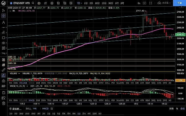以太坊昨日白盘走出一波回踩,低位跌至2196一线止跌反弹,晚间行情一路上行最高触及2283一线受阻,恭喜跟上低多思路的朋友,目前币价在2270附近运行,四小时级别受大饼影响行情跟着拉伸一波,反弹力度不算大,短期突破震荡区间,macd虽呈多头金叉状态,但延续性不强,上方承压明显有回踩需求,短期先关注2250支撑情况,日线级别ma7拐头向下,整体走势依旧偏弱,若大饼不涨以太坊势必会再次回踩,做多找强的,做空选弱的,后市思路如上文,以低多为主高空为辅,上方压制2280-2300,下方支撑2250-2220