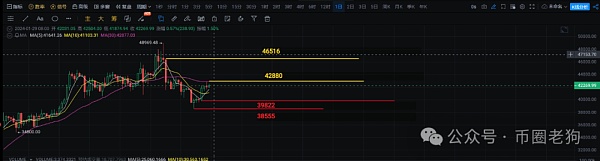 从指标上来看,目前币价受到日线级别30MA均线压制,价格在42880附近,如果大饼持续上涨,短期日线级别收线价格需要站稳42880上方,才能向日线级别强压力为46516进发,46516为日线级别大阴线抛压的高点。