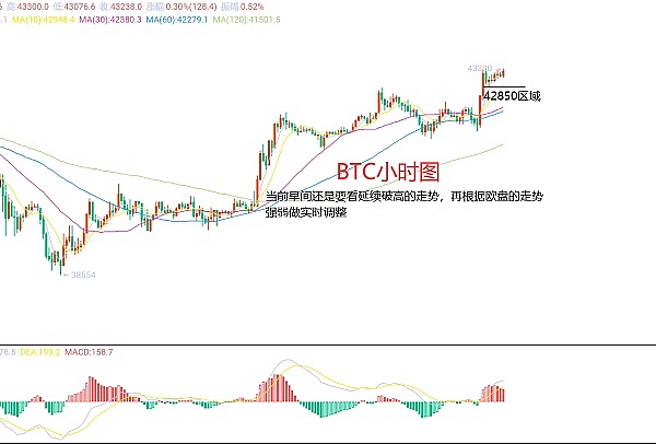 1月30日比特币(BTC)合约技术面分析:今日方面,大周期日线级别昨日报收小阴线,K线形态上连阳单阴,价格在延续上涨破高,附图指标快慢线金叉向上运行,这样来看近期的价格走势还是会以上涨为主,但交易还是尽量短线,毕竟合约和现货还是不一样的,有杠杆的加持,风险利润增加扩大的同时风险也会随之增加;短周期小时图昨日日内还是保持震荡走势,低点在41600区域附近,凌晨后中阳拉伸向上破位前一日高点位置,而早间没有延续,而是在高位横盘整理,高点43300区域附近,破高是大概率;因此今日BTC短线合约交易策略:现价43200区域直接多,止损42850区域,目标看43700-43800区域;