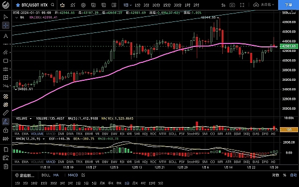 大饼昨日白盘横盘震荡,晚间反弹至43864一线受阻回落但力度不大,凌晨多头发力再次拉升突破前高至44915一线受阻,恭喜跟上昨日思路的朋友多单获利1800点,目前币价在42935附近运行,四小时级别k线插针回落由阳收阴可见上方压制较强,短期k线连阴,macd转为空头双线死叉向下,ma7拐头向下,指标共振走势偏向空头,短期还有回落需求,日线级别走势与思路一致向上插针回落,根据思路进空的币友目前获利1500点,日线还有下行空间可继续持有,盘面来看行情在40000-45000区间震荡,可围绕这高空低多操作,上方压制43300-43600,下方支撑42500-42000