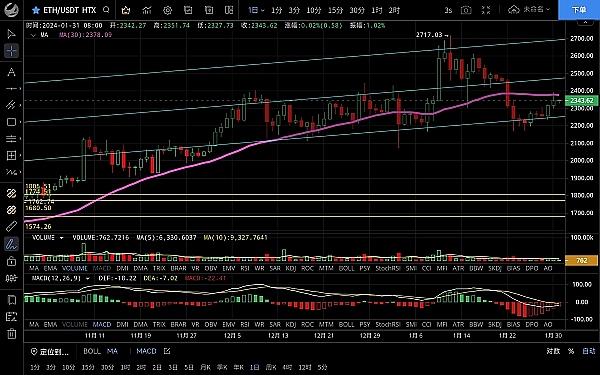 以太坊今日走势非常相似,白盘震荡晚间拉升,昨日晚间最低回踩至2297一线后迅速反弹,最高触及2392一线受阻回落,恭喜跟上昨日思路的朋友多单获利100点,目前币价在2340附近运行,四小时级别k线连阳后收阴,且实体与阳k大小一致,可见上方阻力较强,短期虽收十字阳线但反弹力度不大,macd多头逐步缩量双线金叉状态,下方有ma7支撑,预计破位的概率较大,短期还有下行需求,日线级别已经突破ma60上方,且macd空头逐步缩量双线有形成金叉的迹象,ma7拐头上行,若日内回踩不破,后市有再次上涨的机会,整体思路依旧,回踩低多为主高空为辅,上方压制2360-2400,下方支撑2320-2300