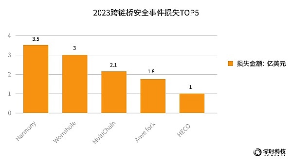 2023年,发生安全事件损失Top5的跨链桥为:Harmony、Wormhole、MultiChain、Aave fork、HECO,分别损失金额为:3.5亿美元、3亿美元、2.1亿美元、1.5亿美元和1亿美元。