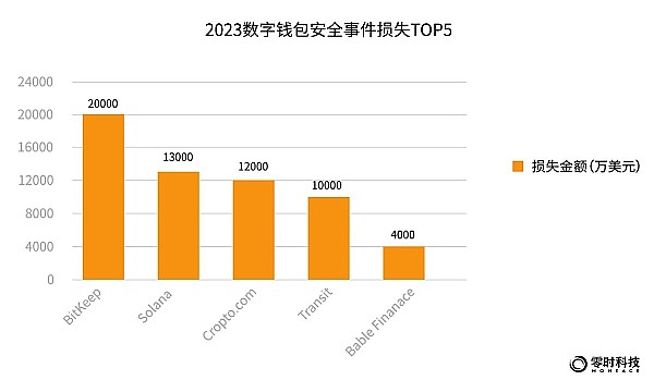 2023年,被攻击损失Top5的钱包安全事件主要来自:BitKeep、Solana、Cropto.com 、Transit、Bable Finanace,分别损失金额为:2亿美元、1.3亿美元、1.2亿美元、1亿美元和4000万美元。其中BitKeep被攻击损失金额最高。