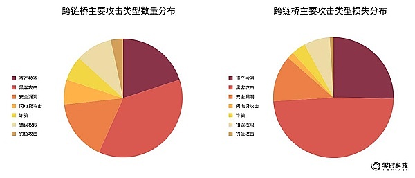 从安全事件发生的数量看,跨链桥攻击的类型主要为:黑客攻击、资产被盗、安全漏洞、错误权限和闪电贷攻击,分别占比61%、33%、28%、17%和11%。从损失金额来看,黑客攻击占比最大,为55%;资产被盗次之,占比29%;安全漏洞占比14%,位居第三。