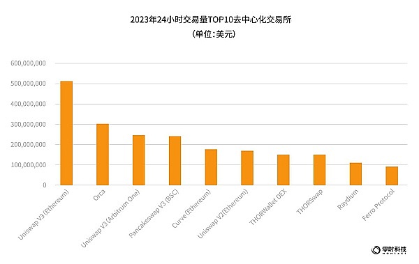 交易量排名前10名的去中心化交易所分别为:Uniswap V3(Ethereum)、Orca、Uniswap V3(Arbitrum One)、PancakeSwap(V3)、Curve(Ethereum)、Uniswap V3(Ethereum)、THORWallet DEX、THORSwap 、Raydium、Ferro Protocol,其中Uniswap以一己之力占据前十名多位。