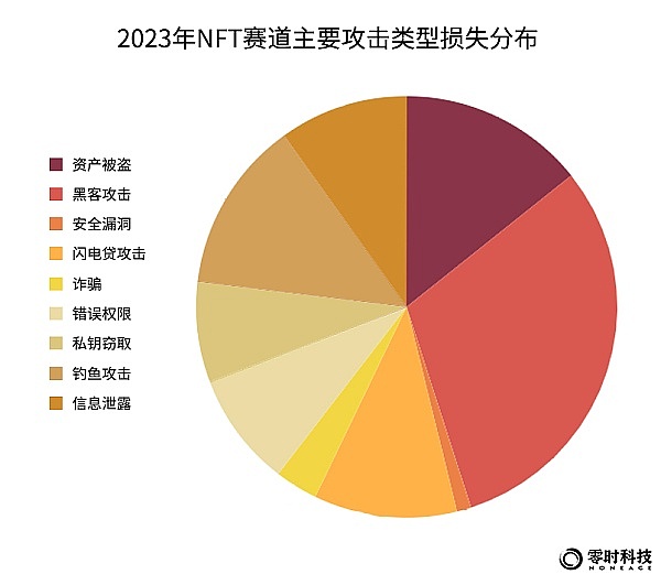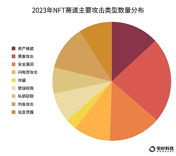 从NFT赛道的攻击类型来看,主要为:黑客攻击、安全漏洞、资产被盗、钓鱼攻击和,对应安全事件数量占比分别为50%、35%、25%、23%。