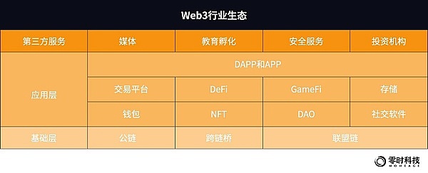从用户视角看Web3生态,可分为基础层、应用层和第三方服务。基础层以公链、跨链桥和联盟链等链为主,为Web3提供网络基础设施;应用层则以APP(中心化应用程序)和DAPP(去中心化应用程序)为主,即用户常用来交互的应用程序,包含交易平台、钱包、DeFi、NFT、GameFi、DAO、存储和社交软件等。基础层和应用层促进了Web3生态的繁荣,但也为Web3带来巨大的安全隐患。服务生态是Web3行业的第三方,其中媒体、教育孵化和投资机构为行业提供助力,安全服务机构如零时科技,是为Web3安全保驾护航不可或缺的一部分。