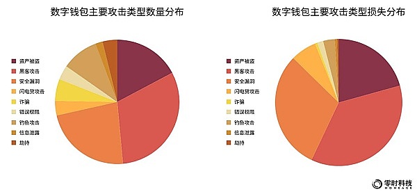 据零时科技数据统计,从安全事件数量来看,数字钱包的攻击类型主要为:黑客攻击、资产被盗、安全漏洞、钓鱼攻击和诈骗,分别占比44.9%、35.5%、27%、13.4%、9.8%。攻击占比最高,居于首位。
