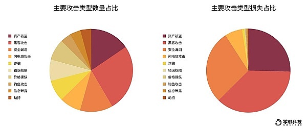 从数量来看,公链的攻击类型主要为:黑客攻击、资产被盗、安全漏洞、闪电贷攻击和诈骗,其对应占比为:46.1%、30.7 %、23%、15.4%、15.4%。从损失金额来看,黑客攻击造成损失最高,为1.67亿美元,占比60.1%;安全漏洞造成损失位居第二,为1.31亿美元,占比46.7%。(注:部分项目遭受多种类型攻击)