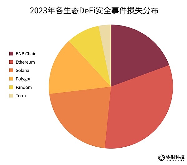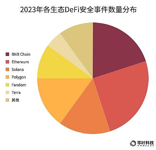 以各DeFi发生安全事件损失分布来看,排名前三的公链生态是,Ethereum生态DeFi事件损失金额超2.16亿美元,占比30%,位列第一;Solana位列第二,损失金额1.44亿美元,占比20%;BNB Chain位列第三,损失金额为1.3亿美元,占比18%。由此可见,生态越是活跃,越受到黑客关注,损失也最为突出。