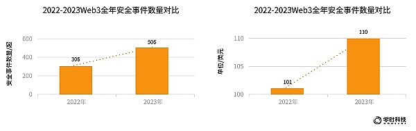 2、据零时科技数据统计,2023年共发生安全事件506起,累计损失达110亿美元。相比2022年,今年Web3安全事件新增110起,同比增长65.3%。
