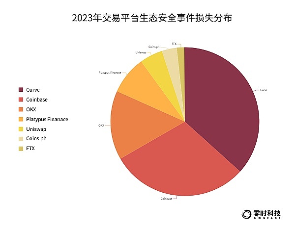 据零时科技区块链安全威胁情报平台数据统计,2023年,发生安全事件损失Top6的交易平台为:Curve,Coinbase, OKX,Platypus Finanace, Uniswap,Coins.ph ,损失金额分别为4.4亿美元,3.6亿美元,1.8亿美元,1亿美元,6000万美元和4000万美元。