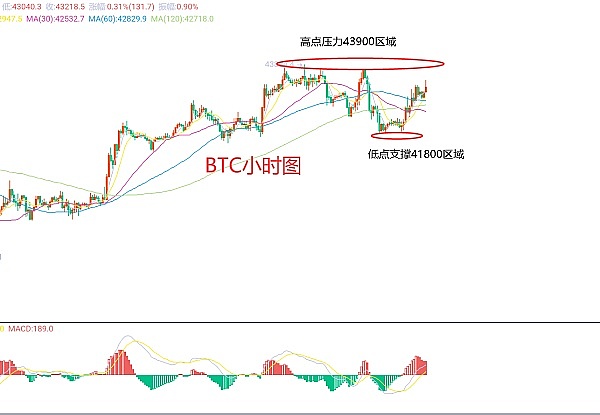2月2日比特币(BTC)合约技术面分析:今日方面,大周期日线级别昨日报收小阳线,K线形态上连阳上涨,价格在均线上方,附图指标金叉运行,这样来看大趋势上还是上涨优势,但需要注意的是价格上涨的力度和延续不强势,容易出现回撤的走势,,所以交易还是保持短线为主;短周期小时图前一日早间下跌但没有破低,欧盘横盘整理,美盘冲高,当前小时图K线形态连阳,附图指标金叉运行,但价格还没有破高,所以欧盘的强弱是关键,上方压力位置43900区域,支撑41800区域;因此今日BTC短线合约交易策略:反抽43600区域空,止损43900区域,目标看43000-42800区域;