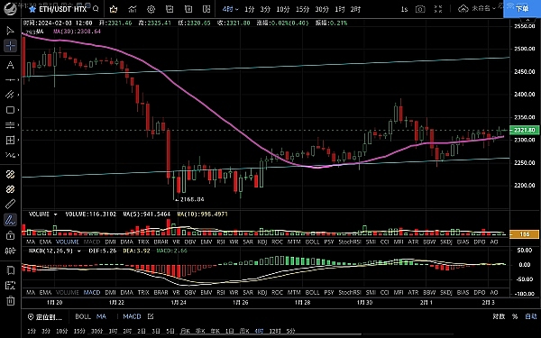 以太坊今日走势联动大盘,昨日晚间回踩至2282一线后支撑反弹,高位触及2323一线再次回落,恭喜跟上昨日思路的朋友空单获利40点,目前币价在2322附近运行,四小时级别k线连阳反弹突破ma90压制,短期走势比大饼稍强,macd转为多头但量能不足双线呈金叉状态,ma7拐头向上呈指标共振,走势来看还有上冲的可能,空单切勿着急进场,日线级别来看盘面来看底部逐渐抬高,下方回踩后反弹,可见支撑力度挺强,短期虽受ma60压制但预计这两天就会突破,短线没有方向依旧是震荡为主,2160-2400区间不破高空低多对待,上方压制2370-2400,下方支撑2300-2270