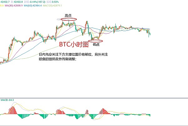 2月5日比特币(BTC)合约技术面分析:今日方面,大周期日线级别昨日报收小阴线,K线形态上连阴下跌,价格在均线下方,附图指标金叉运行,但动能在缩量,自上周价格冲高44000区域附近后承压开始回撤,虽说整体力度不大,而下跌的趋势还是比较明显的;短周期小时图高点压力位置43900区域附近,低点支撑41800区域附近,本周还是先关注这个区间的波动,当前K线形态连阴下跌,附图指标死叉向下,那么这样来看日内还是有下跌的需求的,因此今日BTC短线合约交易策略:现价42450区域直接空,止损放在42800区域,目标看42000-41800区域;