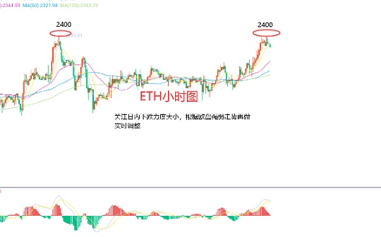 2月7日以太坊(ETH)合约技术面分析:今日方面,大周期日线级别昨日报收小阳线,K线形态上连阳上涨,价格在均线上方,附图指标金叉运行,在趋势上上涨是非常明显的,但还需关注其力度和延续问题,以及消息面造成的刺激导致价格下跌;短周期小时图昨日日内上涨,欧盘破高,美盘延续今日早间价格承压回撤,高点在2400区域附近,当前K线形态连阴,附图指标死叉运行,日内是还有下跌需求的,因此今日ETH短线合约交易策略:现价2375区域直接,止损2400区域,目标看2330区域
