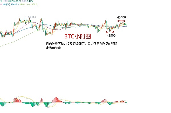 2月7日比特币(BTC)合约技术面分析:今日方面,大周期日线级别昨日报收小阳线,K线形态上连阳上涨,价格在均线上方,附图指标金叉运行,虽说整体上涨力度不大,也没有向上破高要价,但趋势还是强势,低点上移,下跌没有力度等都是比较明显的;短周期小时图昨日日内慢涨,欧盘修正后美盘以及凌晨价格支撑反弹,今日早间试探压力后承压开始回撤,当前K线形态连阴,附图指标死叉向下,那么日内是还有下跌需求的,力度及延续重点关注欧盘;因此今日BTC短线合约交易策略:现价43050区域直接空,止损43400区域,目标看42500-42300区域;