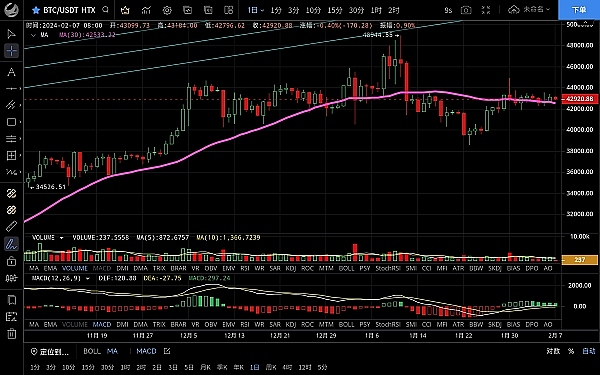 大饼昨日波动不大呈震荡走势,晚间回踩至42650附近支撑反弹,最高触及43400附近受阻,恭喜跟上思路的朋友,目前币价在42930附近运行,四小时级别行情整体围绕ma30上下波动,空间不大呈横盘走势,ma均线缠绕,macd无量运行双线粘合,目前走势偏弱短期还有回踩需求,关注42600支撑情况,日线级别下方受ma14支撑底部逐渐抬高,k线收阳短期虽有回落预计力度不会太大,走势来看有上冲的可能,整体仍在区间震荡,建议高空低多对待,上方压制43300-43800,下方支撑42600-42200