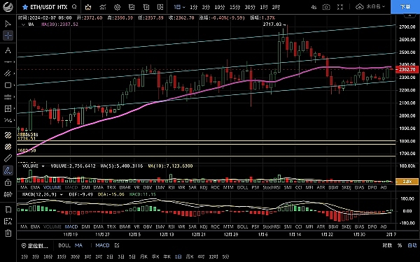 以太坊昨日走势比大饼强势,行情连阳反弹一路上行至2391一线受阻回落,恭喜跟上昨日思路的朋友,目前币价在2363附近运行,四小时级别行情一路上行突破多个压力,在2400关口附近受阻回落,k线连阴下行,macd多头缩量双线金叉状态,短期走势虽偏向回踩但力度不会太大,预计还会试探2400附近,日线级别突破ma60后上行被ma30均线压制,短期突破概率不大,若回踩不破ma60预计会震荡一段时间然后再走突破,思路建议高空低多对待,上方压制2380-2400,下方支撑2330-2300
