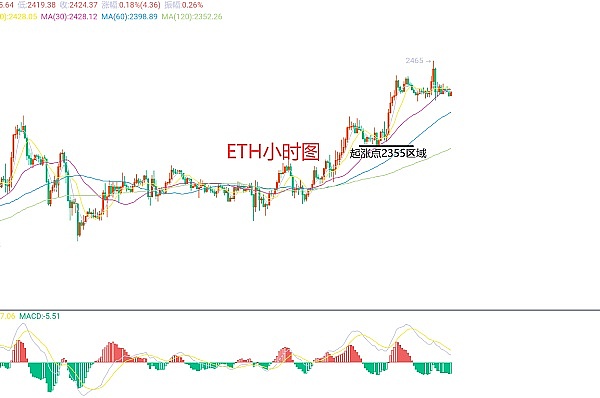 2月9日以太坊(ETH)合约技术面分析:今日方面,大周期日线级别昨日报收小阳线,K线形态上连阳上涨,价格在均线行方,附图指标金叉放量运行,儿价格偏离均线回归均线支撑在2385区域附近,那么今日在等回撤做多的同时也要注意回撤修正的风险概率;短周期小时图前一日早间上涨延续破高,日内整体震荡,晚间美盘受到大饼带动出现较快的涨跌震荡走势,当前承压向下回撤修正,下方均线支撑在2385区域,阻力在2465区域,因此今日ETH短线合约交易策略:回撤2385区域多,止损2360区域,目标看2435-2450区域