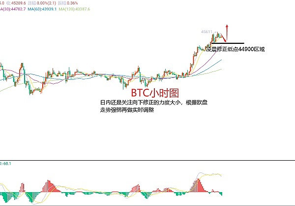 2月9日比特币(BTC)合约技术面分析:今日方面,大周期日线级别昨日报收小阳线,K线形态上连阳上涨,价格运行在均线上方,附图指标金叉放量运行,儿需要注意的是,当前价格偏离均线,回撤均线支撑位置在44200区域,所以我们在做多的同时一定要注意回撤修正的风险;短周期小时图昨日美盘支撑上涨,凌晨延续,今日早间承压向下修正,当前K线形态连阴下跌,附图指标死叉向下,儿凌晨回撤的低点位置在44900区域附近,日内还是看修正,因此今日BTC短线合约交易策略:回撤44900区域多,止损44550区域,目标看45400-45500区域;