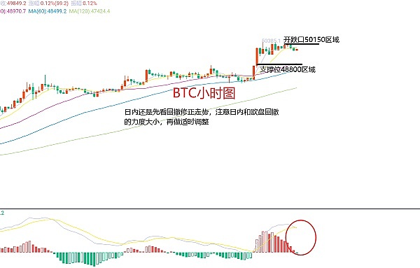 2月13日比特币(BTC)合约技术面分析:今日方面,大周期日线级别昨日报收小阳线,K线形态上连阳上涨,价格在均线上方,附图指标金叉放量运行,价格偏离均线,回撤均线支撑位置在48500区域附近,整体走势还是非常明显的强势走势,需要注意的还是回撤风险,以及进场时间;短周期小时图昨日美盘价格支撑反弹上涨,凌晨横盘整理,当前价格承压出现回撤,K线形态连阴,附图指标快慢线有粘合死叉迹象,那么日内还是有回撤修正的需求,因此今日BTC短线合约交易策略:现价49800区域直接空,止损50150区域,目标看48800区域,回撤48800区域多,止损48450区域,目标看49500区域;