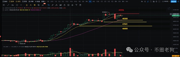 如果大饼持续下跌,短期需要关注48300附近,48300为短期四小时级别的低点,如果48300跌破,短期要关注47841附近,47841是短期四小时级别放量上涨的最低点。第三支撑位就是46800,46800是大饼之前达到新高后,四小时回踩的低点。