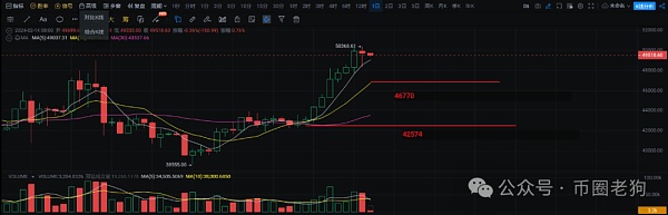 如果大饼价格下跌,短期需要关注日线级别5 10MA均线46770附近支撑是否有效,如果短期日线级别不跌破46770,并且在46770附近日线级别收阳线,那么大饼短期大概率会反弹,价格继续向新高进发,(日线级别级别5 10MA均线会随着时间的推移点位出现变化)。如果价格快速跌破46770附近,那么就要关注下方日线级别强支撑42574附近,42574为日线级别收线站稳5 10MA后,价格一路来到新高的最低点,同时也是日线级别强支撑位。