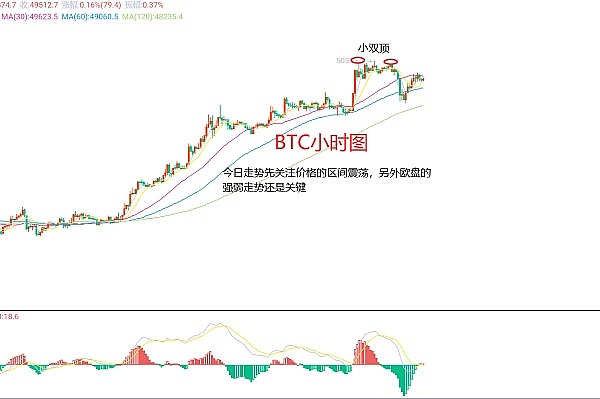 2月14日比特币(BTC)合约技术面分析:今日方面,大周期日线级别昨日报收小阴线,K线形态上连阳单阴,附图指标金叉放量运行,大周期走势上还是上涨又是,且小阴线是带有长下影线的,价格也是回撤修正后反弹的,只是回撤没有力度,但还是那句话,回撤下跌的风险还是要注意;短周期小时图昨日日内价格高位横盘整理,晚间美盘承压回撤,低点在48300区域附近,高点压力位置在50400区域附近,而昨日反弹价格是没有破高,此前形成小双顶的形态,因此今日BTC短线合约交易策略:反抽50000区域空,止损50400区域,目标看49200-49000区域;回撤49000区域多,止损48700区域;目标看49700区域;