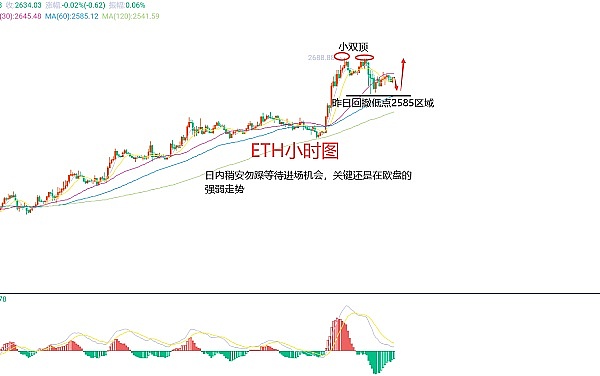 2月14日以太坊(ETH)合约技术面分析:今日方面,大周期日线级别昨日报收小阴线,K线形态上连阳单阴,价格在均线上方,附图指标金叉放量运行,所以在大周期走势上整体还是非常强势的,而回撤是看不大力度的,昨日就是比较明显的体现了这一点,但还是要防范回撤下跌风险;短周期小时图高点小双顶压力位2689区域,昨日美盘回撤支撑低点在2585区域;当前价格还是在高位横盘整理,K线形态单阴单阳,附图指标死叉缩量运行,因此今日ETH短线合约交易策略:反抽2660区域空,止损2690区域,目标看2600区域,回撤2600区域多,止损2580区域,目标看2650区域