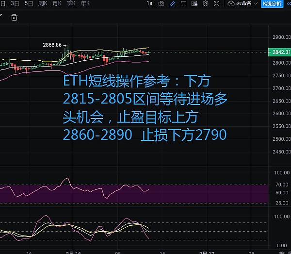 ETH短线操作参考:下方2815-2805区间等待进场多头机会,止盈目标上方2860-2890 止损下方2790