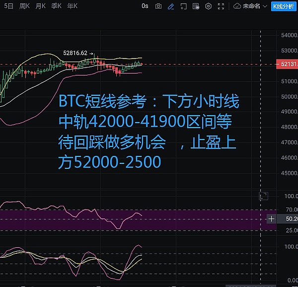 BTC短线参考:下方小时线中轨42000-41900区间等待回踩做多机会 ,止盈上方52000-2500