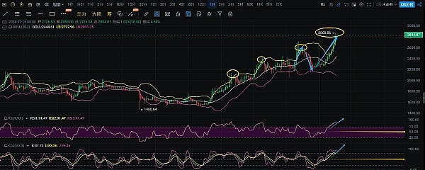 先看下今天以太坊日线级别走势,K线依旧强势的多头排列,一路震荡上行。反弹高点也呈现阶梯走高。这对于套牢的空头仓位是毁灭性的。此时指向说2880都未必回事这轮多头的末期。空头朋友如果还未爆仓即使止损重头再来吧!
